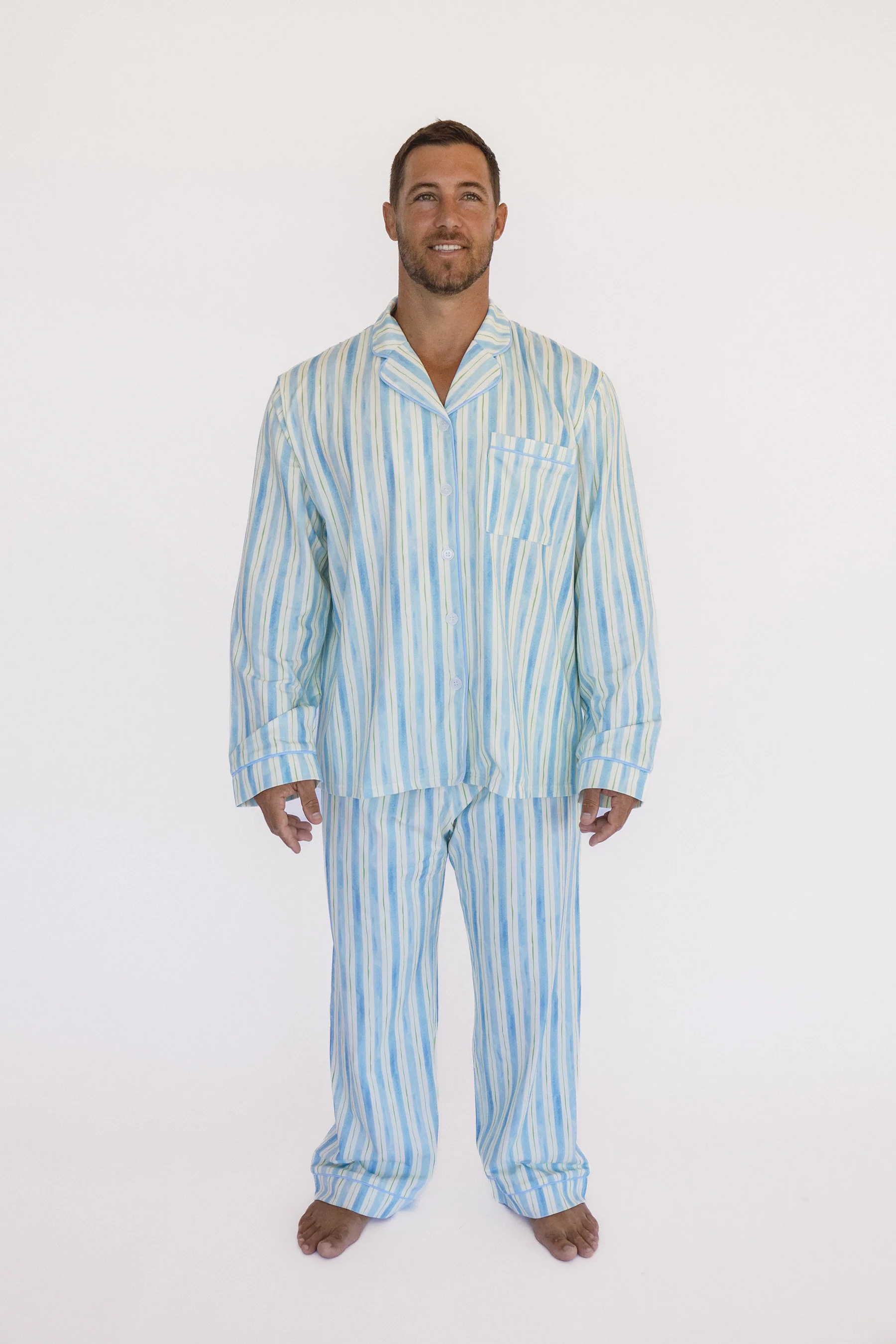 Introducing our new collection, Hoppy Days. The Adult Duck Egg Pyjamas are crafted from a comfortable blend of 95% cotton and 5% spandex, offering the perfect fit and ultimate comfort. In a soothing duck egg stripe, they include a cozy top and matching pants, perfect for lounging or relaxing at home. Embrace comfort and style with this delightful addition to your wardrobe!
